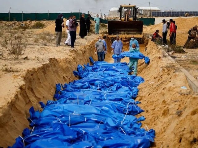 الشفا اسپتال سے ملنے والی لاشوں کی اجتماعی قبر میں تدفین کردی گئی؛ ویڈیو وائرل
