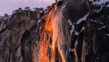 یوسمائیٹ نیشنل پارک کی مشہور آبشار فروری میں سرخ و نارنجی روشنی سے جگمگا اُٹھتی ہے